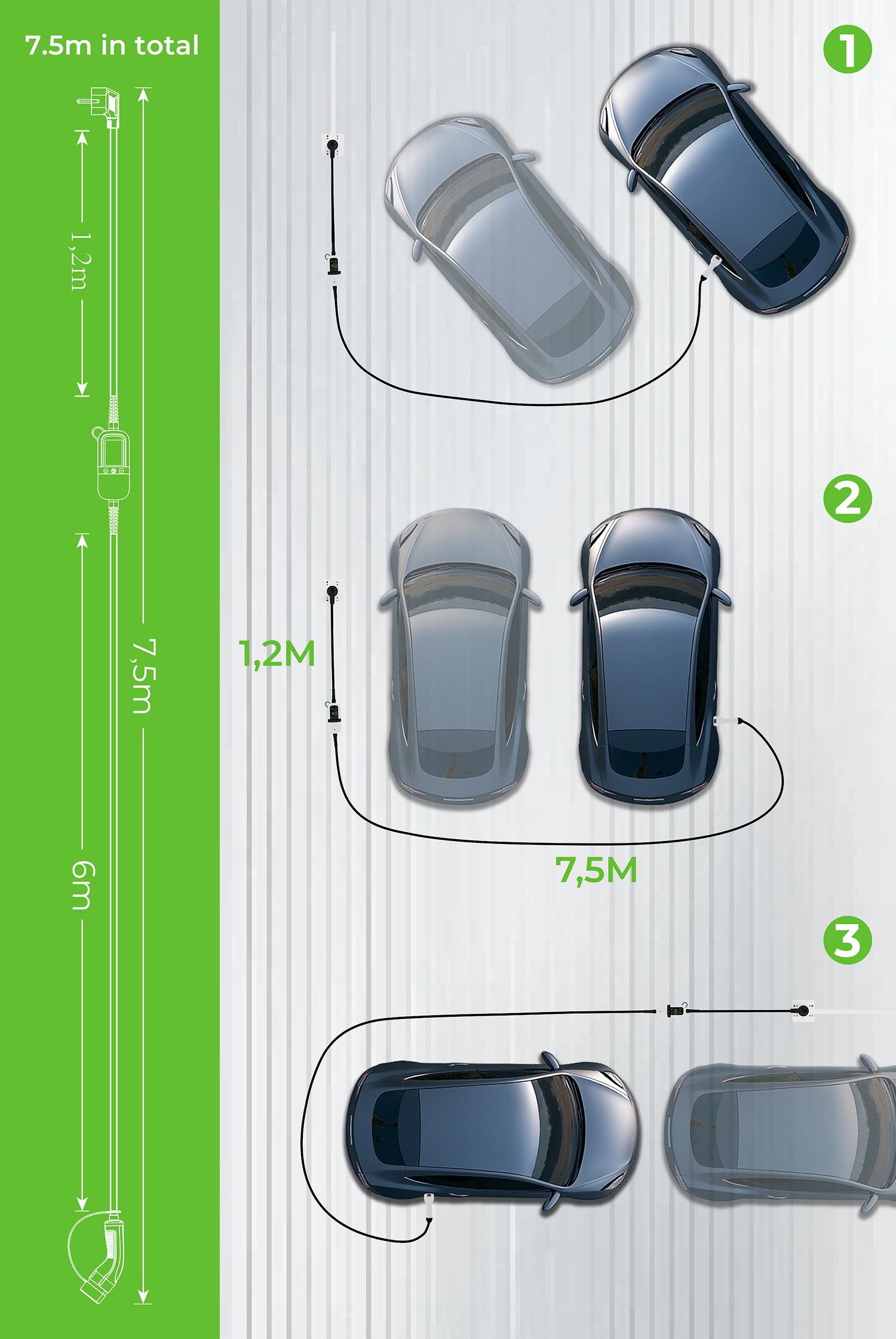 Duljina kabela ovisi o udaljenosti između baze za punjenje i utikača u vozilu. Preporučeno. Duljina vozila + 1,5 m/2 m = duljina kabela. Ukupna duljina od 7,5 m prikladna je za gotovo sve kućne i privremene primjene na otvorenom.