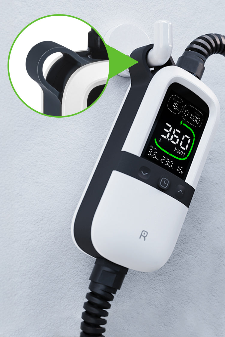 Ovaj EV punjač dolazi s ugrađenom kukom tako da se može lako objesiti dok je u upotrebi. Nudi fleksibilnost u različitim okruženjima punjenja i osigurava uštedu prostora i urednu upotrebu.