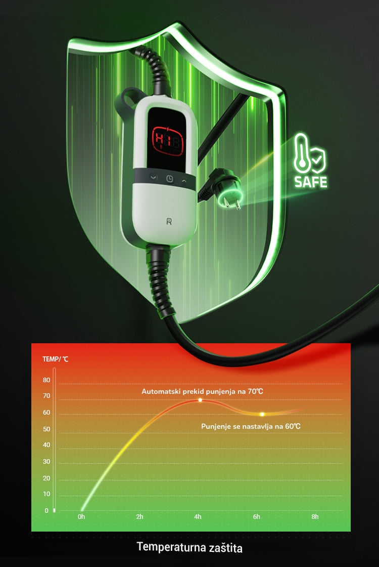 Punjenje se automatski zaustavlja ako temperatura utikača prelazi 70°C i nastavlja se kada se ohladi na 60°C, čime se osigurava sigurnost i hladnoća tijekom dužeg punjenja